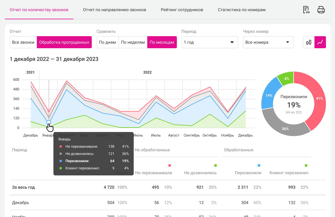 На всплывающей подсказке вы сможете увидеть статусы пропущенных, количество таких звонков, а также их процентное соотношение к общему числу неотвеченных вызовов.