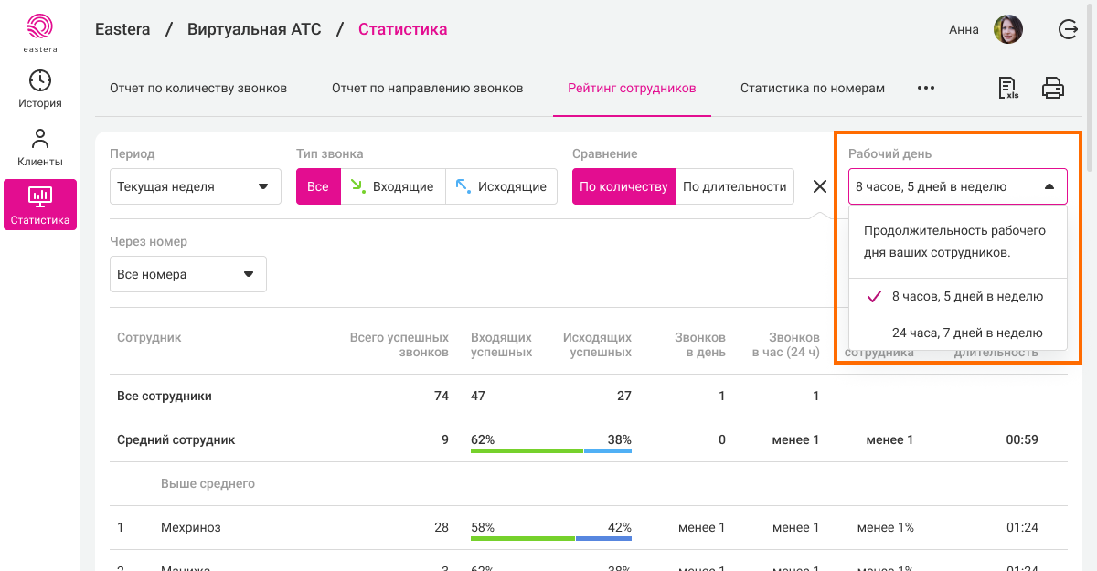 В настройках отчета вы можете выбрать два режима рабочего времени, с учетом которого будет производиться расчет показателей: круглосуточный или восьмичасовой.