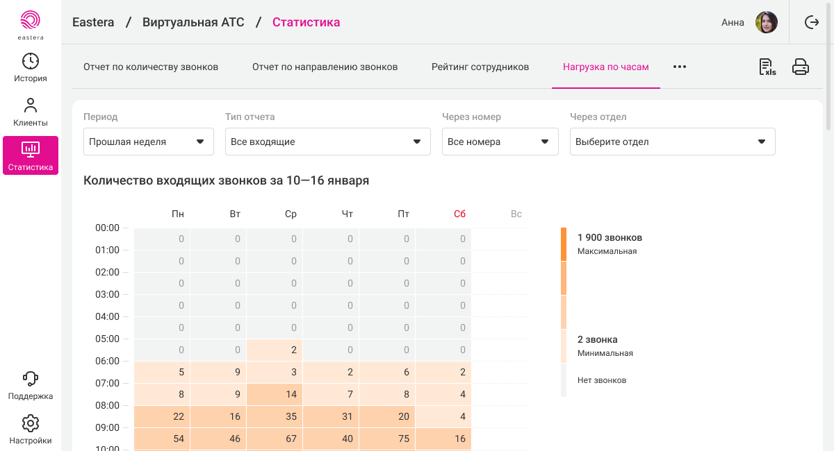 Вывод: с 9 до 10 по четвергам сотрудники могут обработать до 12 входящих. После этого вы можете открыть отчет по всем входящим и посмотреть, больше или меньше звонков по факту поступает в компанию в это время. Нужно ли поставить смену еще одному сотруднику в это время, сократить число сотрудников в этот час или оставить без изменений.