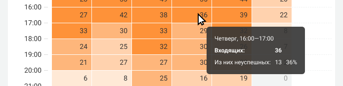 3. По неуспешным исходящим поймете, в какое время клиенты реже берут трубку и когда эффективнее их обзванивать. Для объективности учитывайте не только число неуспешных исходящих, но и их долю среди всех исходящих в выбранный час. Чтобы узнать долю неуспешных звонков среди всех исходящих, откройте отчет по всем исходящим и наведите курсор на любую ячейку.