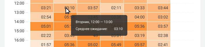 Отчет «Нагрузка по часам» показывает, в какое время и в какие дни недели сотрудники чаще и дольше всего общаются с клиентами.