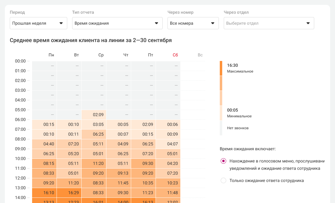• только ожидание ответа сотрудника — то есть как долго клиенты слушали гудки.