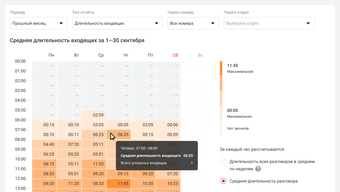 • Длительность всех разговоров в среднем по неделям — это средняя суммарная длительность входящих в этот час в выбранном периоде. Значение ячейки «Чт с 9:00 до 10:00» в таком случае будет рассчитываться иначе: