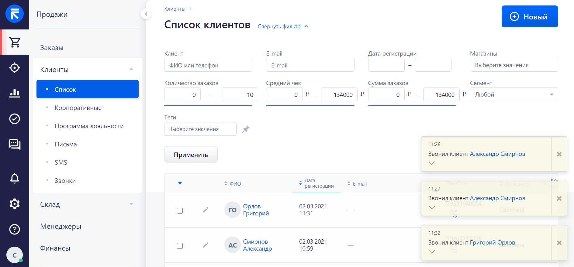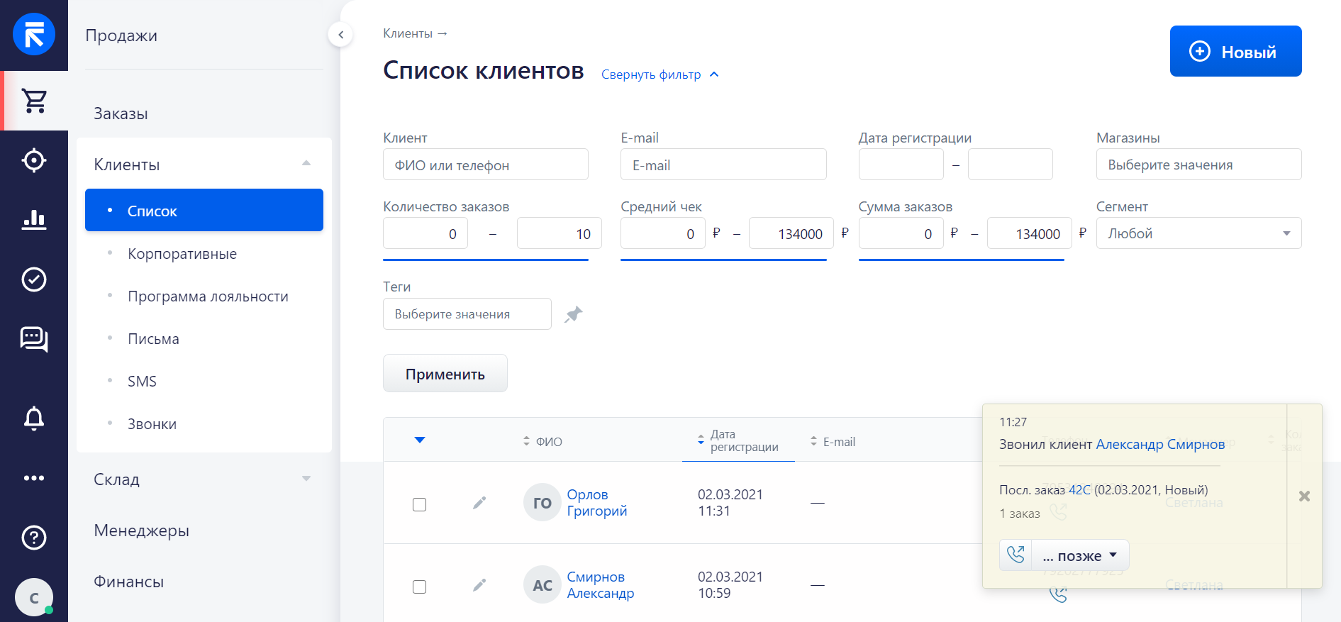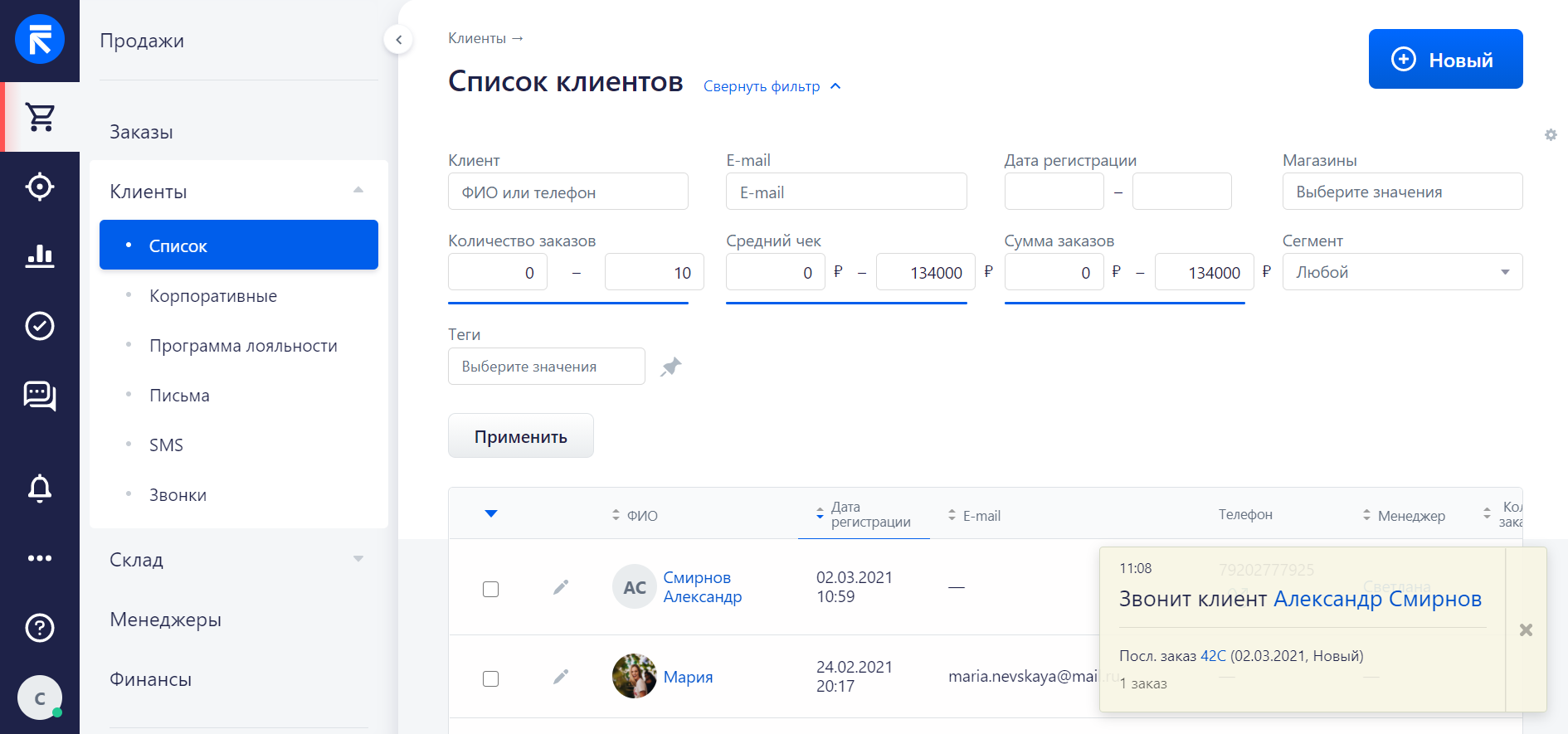 • на имя клиента, чтобы перейти в карточку клиента и получить всю информацию о его взаимодействиях с вашей компанией (оформленные заказы, участие в программах лояльности и т.д.),