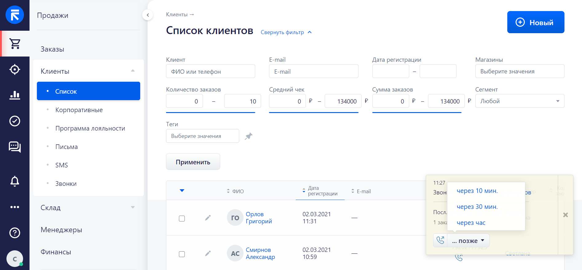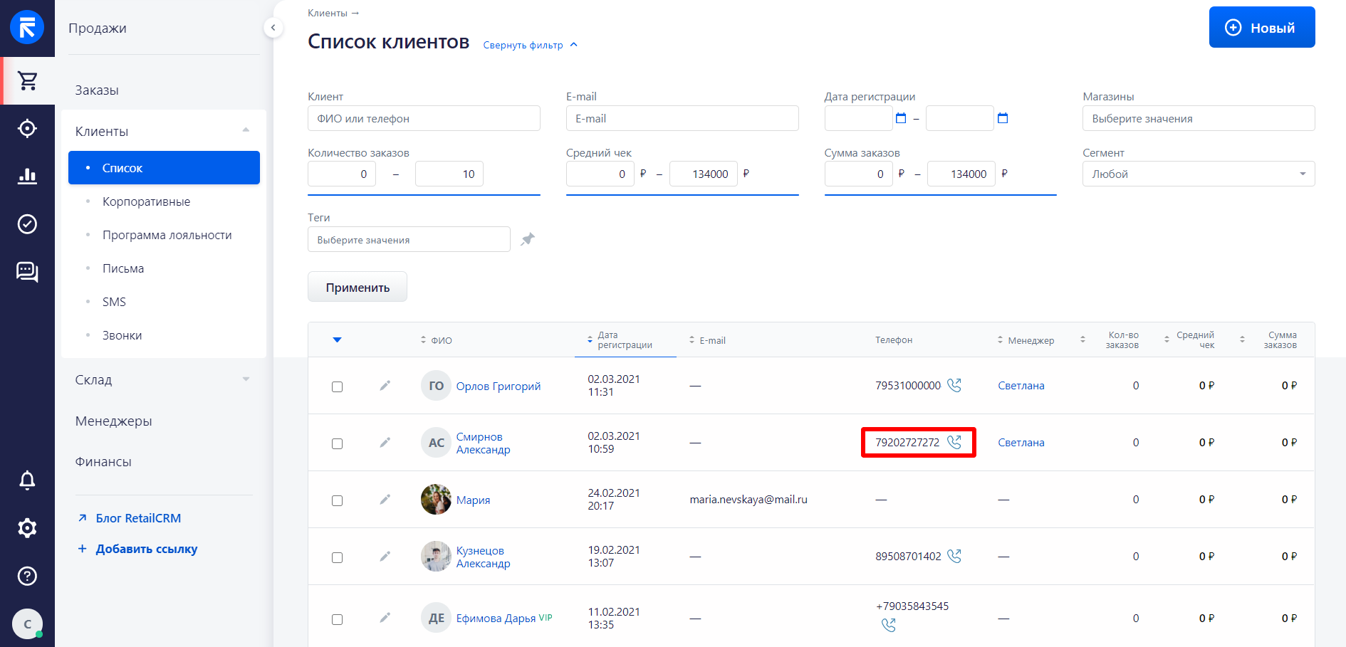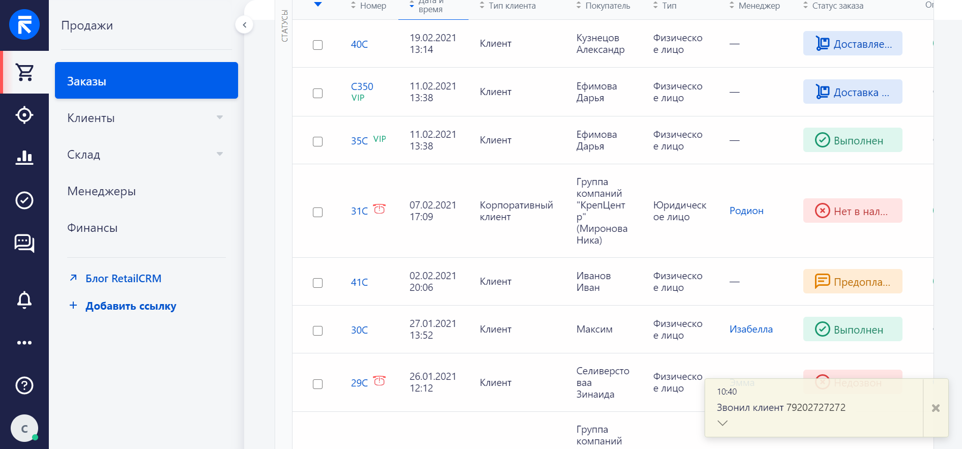 • на имя клиента, чтобы перейти в карточку клиента и получить всю информацию о его взаимодействиях с вашей компанией (оформленные заказы, участие в программах лояльности и т.д.),