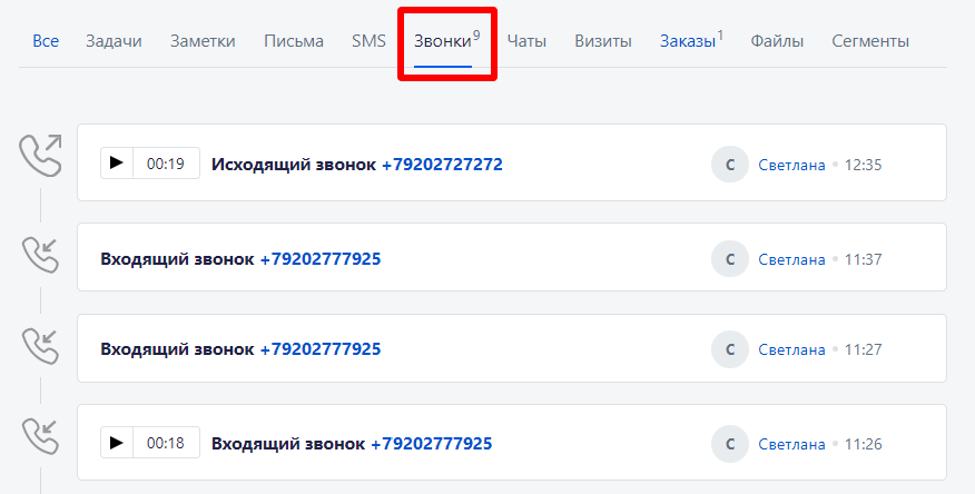 Чтобы получить информацию о всех телефонных разговорах с клиентом и их записи, в карточке клиента откройте вкладку «Звонки».