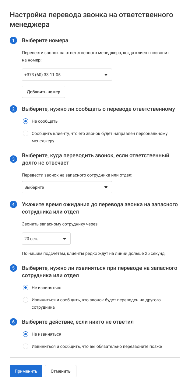 Если ваша компания использует несколько номеров, вы можете настроить сценарии работы в RetailCRM для всех номеров сразу или для каждого в отдельности. Как настроить подобные сценарии интеграции читайте в статье.