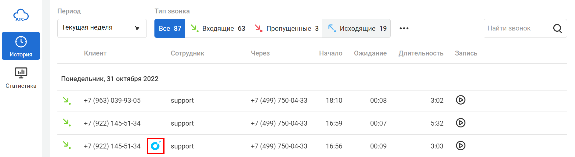 11. Готово! Теперь звонки со всех номеров Roistat, настроенных в сценарии, будут переадресованы в Виртуальную АТС. В разделе «История» звонки, поступившие из Roistat, будут помечены специальным символом.