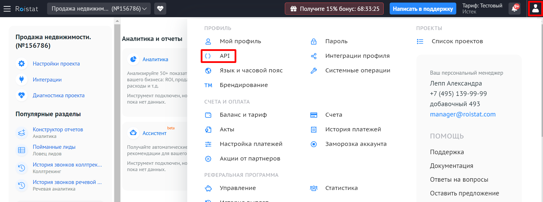 2. В новой вкладке браузера зайдите в ваш аккаунт Roistat, откройте Профиль и перейдите в раздел API.