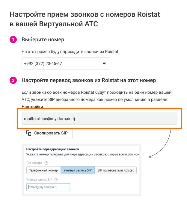 6. Выберите номер Виртуальной АТС, на который будут перенаправляться звонки с номеров Roistat. Скопируйте сгенерированный SIP-адрес. Нажмите кнопки «Применить» и «Сохранить».