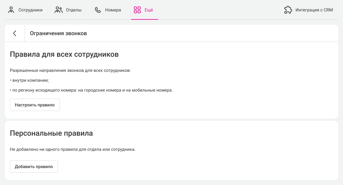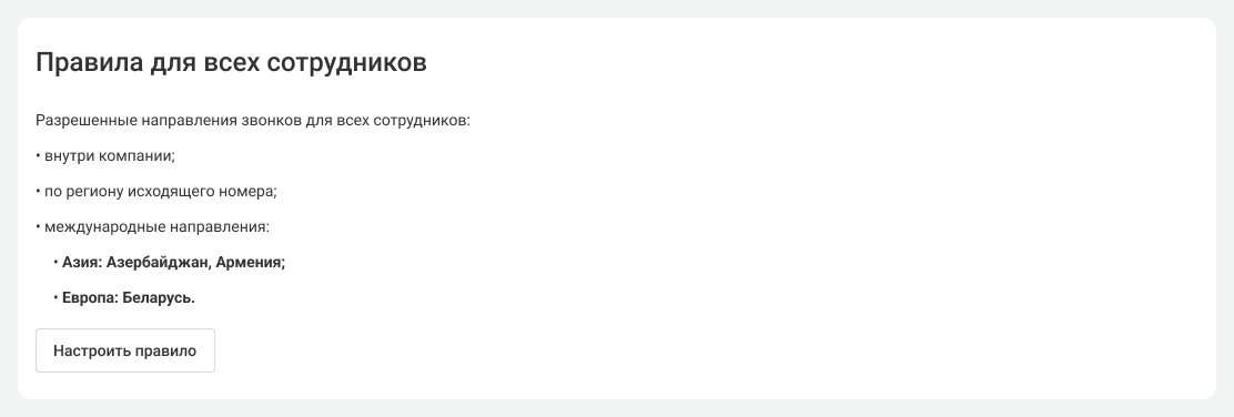 С помощью этих правил вы можете разрешить сотрудникам совершать звонки по определенным направлениям или запретить все исходящие вызовы, кроме внутренних и по региону номера.