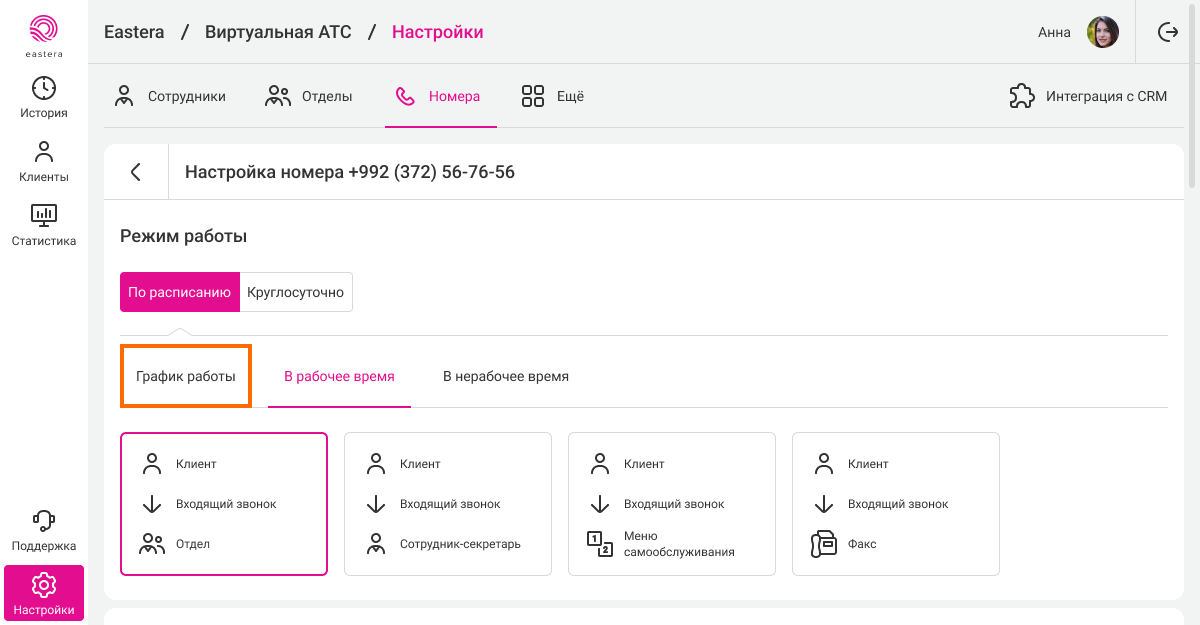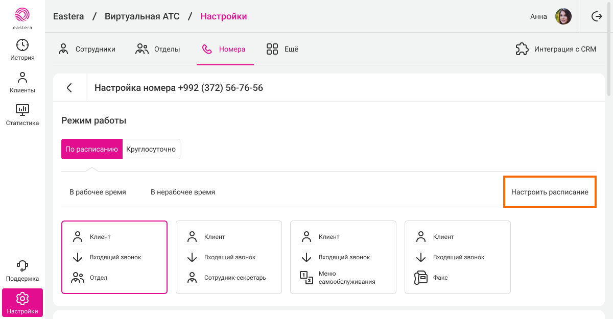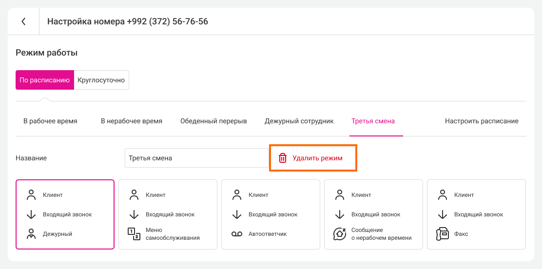 Выберите номер, для которого нужно установить расписание. В разделе «Режим работы» перейдите на вкладку «По расписанию» и нажмите «Настроить расписание».