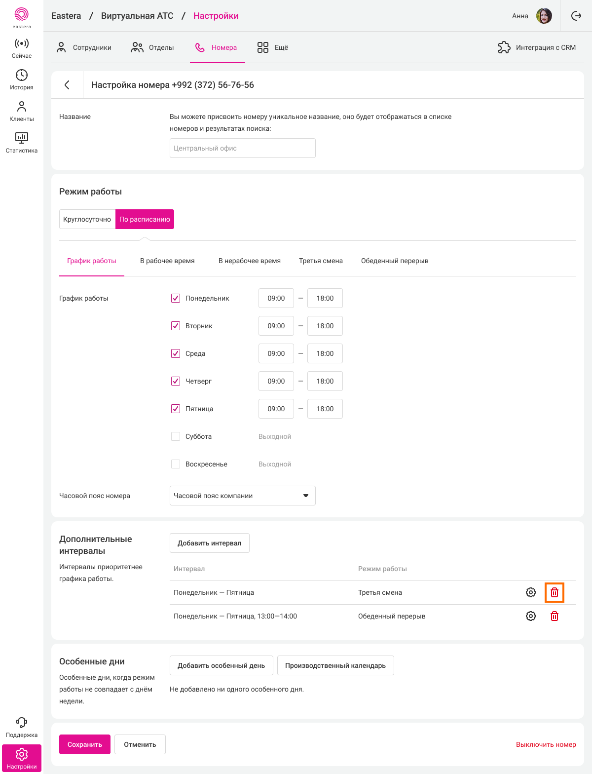 2. Нажмите «Настроить расписание». В блоке «Дополнительные интервалы» найдите режим, который хотите удалить (в нашем примере – «Третья смена»), и нажмите на «корзину» справа.