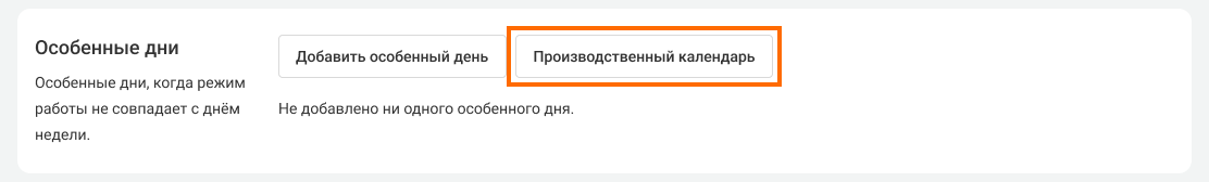 1. В настройках расписания номера перейдите к разделу «Особенные дни» и нажмите на кнопку «Производственный календарь».