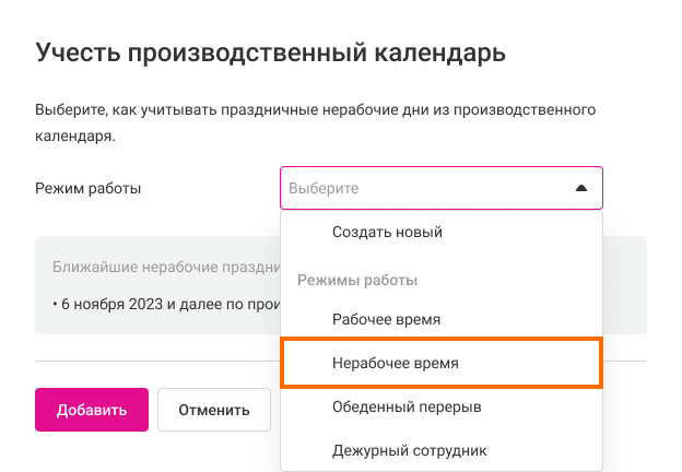 Обратите внимание: если в праздничные дни звонки на номер будет принимать дежурный сотрудник, при настройке производственного календаря в режиме работы выберите вариант «Дежурный сотрудник» и настройте прием звонков.