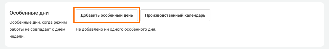 Например, вам нужно в сокращенный рабочий день уменьшить рабочие часы и в начале, и в конце дня. Создайте два особенных дня на одну дату. В первом укажете нерабочее время с утра, а во втором – нерабочее время вечером.