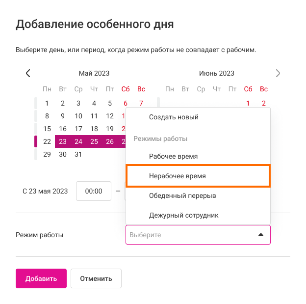 - особенный день – 16 мая с 8:00 до 9:00. И выберите режим работы для этого интервала – нерабочее время или дежурный сотрудник;