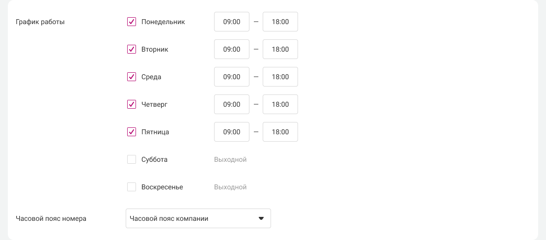 По умолчанию для каждого номера график работы устанавливается в часовом поясе компании. Но если настраиваемый номер должен принимать звонки в другом часовом поясе, отметьте это в расписании номера.