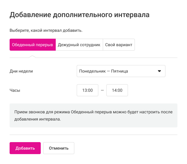 Если работа в вашей компании организована сложнее и для создания корректного расписания вам недостаточно указать время обеденного перерыва и дежурства, вы можете создать собственный дополнительный интервал и настроить для него правила обработки входящих. Своих дополнительных интервалов может быть сколько угодно.
