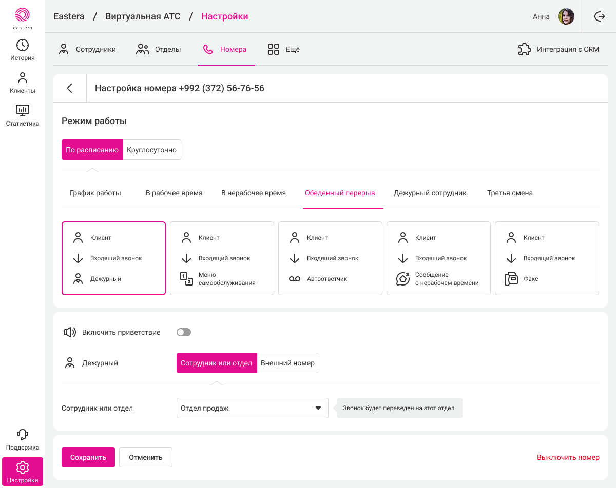 Персональный график работы менеджера устанавливается на вкладке «Сотрудники» в настройках его профиля. В нерабочее время АТС будет исключать сотрудника из очереди приема звонков в отделе и переводить все прямые вызовы, поступившие на его внутренний номер, на коллегу или в отдел. При этом клиенты услышат уведомление об отсутствии менеджера и будут готовы, что им ответит другой специалист.