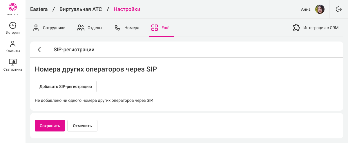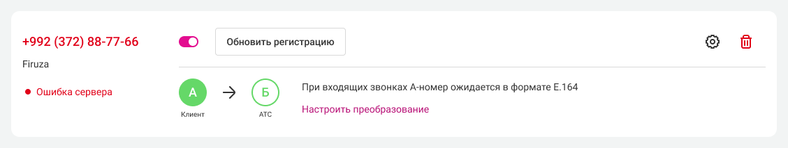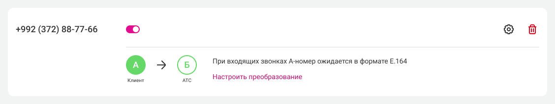 Также в настройках номера будет раздел «При входящих звонках А-номер ожидается в формате E.164». Это техническая информация и, чаще всего, сюда вносить изменения не требуется. Если ваш оператор связи работает не по стандарту E.164, здесь вы сможете настроить преобразование.
