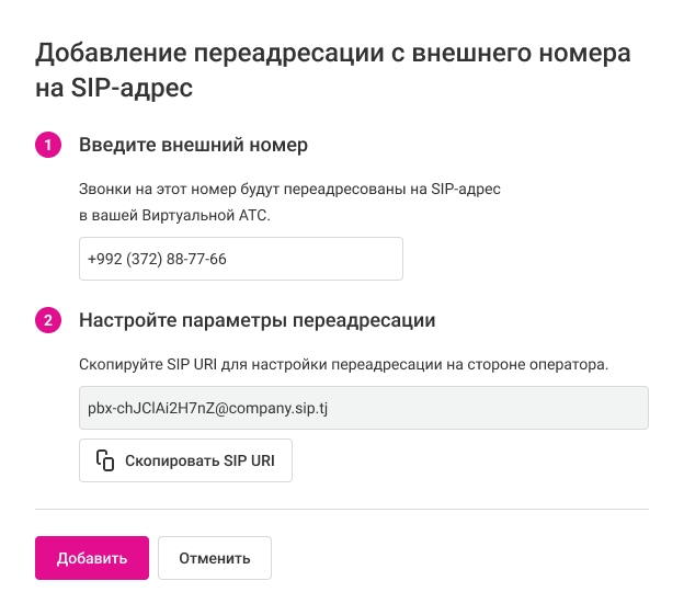 2. Введите номер телефона и скопируйте полученный SIP URI.