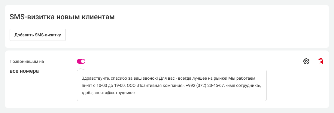 Настройте текст приветственной SMS. Также вы можете настроить, чтобы в SMS автоматически вставлялись контакты сотрудника, с которым говорил клиент (контакты берутся из данных о сотрудниках), настроить время, когда клиент считается новым, а также включить разные SMS-визитки для ваших номеров.