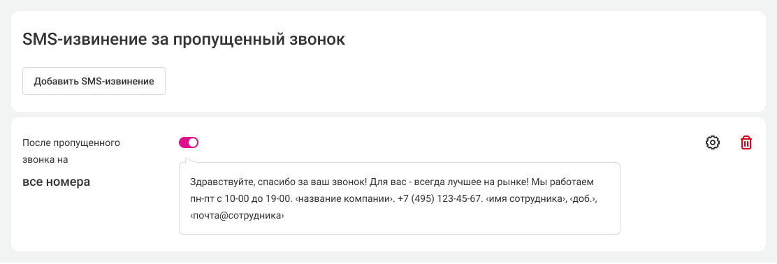 Клиент впервые звонит в вашу компанию и после разговора сразу же получает приветственное сообщение с контактами менеджера. Это позволит клиенту не потерять контакты вашей компании.