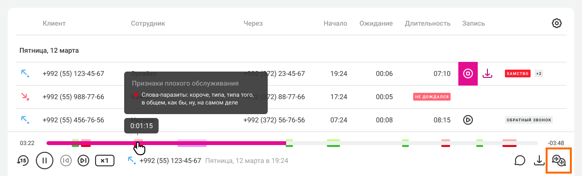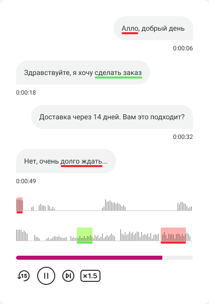 В плеере при прослушивании записи разговора все моменты с признаками продаж и плохого обслуживания будут выделены соответствующим цветом. Вы быстро найдете нужное место в разговоре.