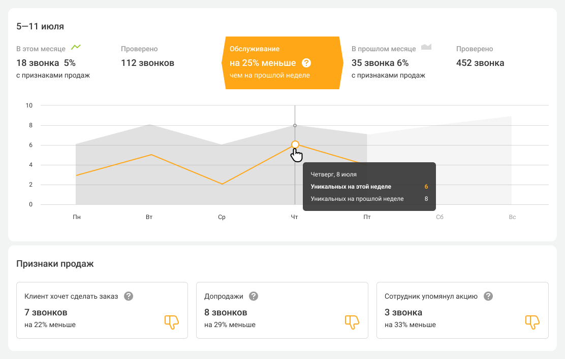 На основе собранных данных Речевая аналитика не только строит понятные отчеты и сравнивает выбранные периоды, но и рассказывает, лучше или хуже стали показатели обслуживания и продаж.