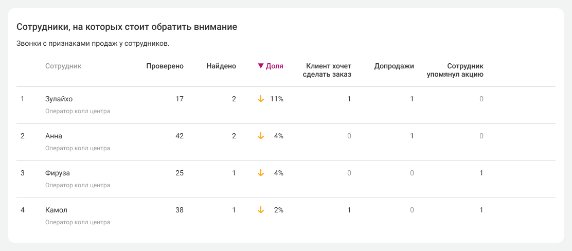 По количеству найденных признаков продаж и плохого обслуживания вы легко сравните результаты работы менеджеров и быстро поймете, почему одни справляются с обслуживанием клиентов менее успешно, чем другие.