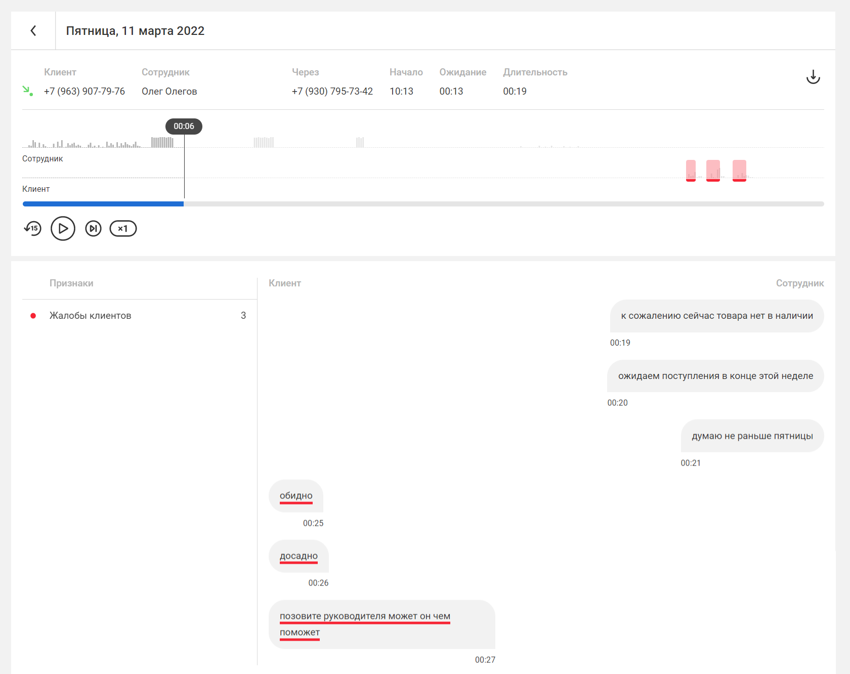 В открывшемся окне в левом столбце вы можете кликнуть на соответствующий признак, чтобы найти место в разговоре, где прозвучали ключевые слова. В правом столбце вы увидите текстовую расшифровку записи. Чтобы работать с расшифровкой было удобнее, Речевая аналитика разделяет реплики клиента и сотрудника, как в мессенджерах.