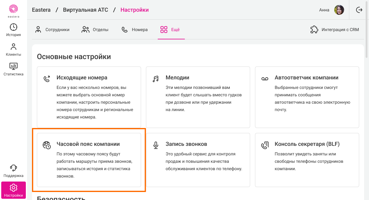 1. В настройках вашей Виртуальной АТС перейдите в раздел «Еще» и выберите раздел «Часовой пояс компании».