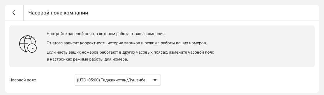 Часовой пояс компании настраивается сразу для всех номеров Виртуальной АТС и для всех сотрудников. Это делается для того, чтобы сотрудники, работающие в разных часовых поясах, не путались во времени.
