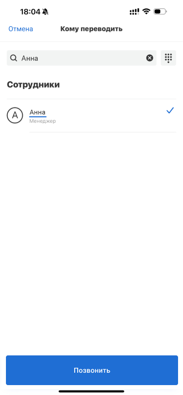Если вы приняли переадресованный звонок на мобильном телефоне, на котором не установлено приложение АТС, вы все равно можете перевести звонок на другого сотрудника.