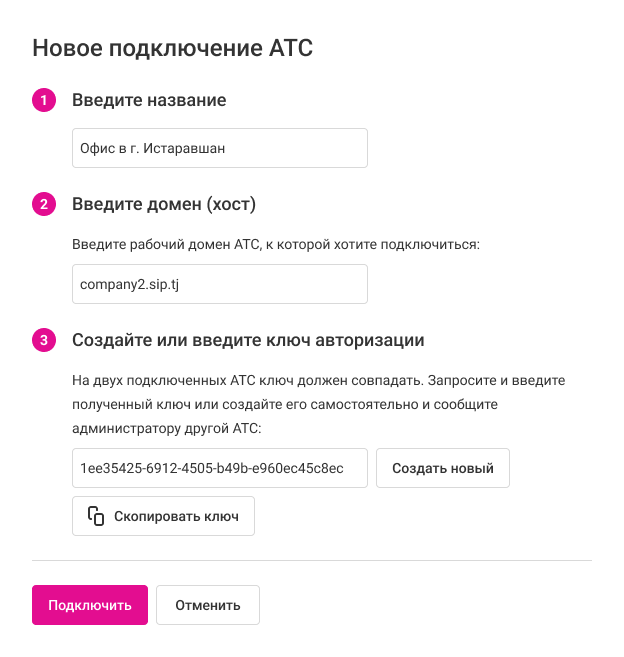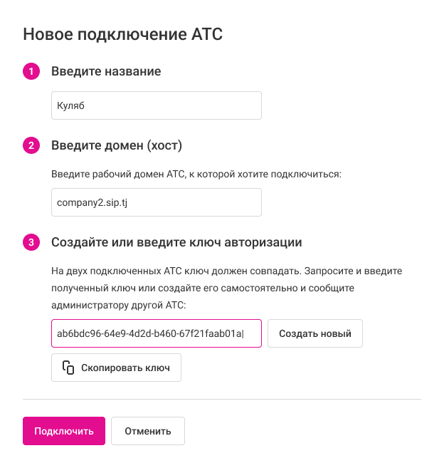 - Домен — адрес той Виртуальной АТС, которую хотите подключить.
