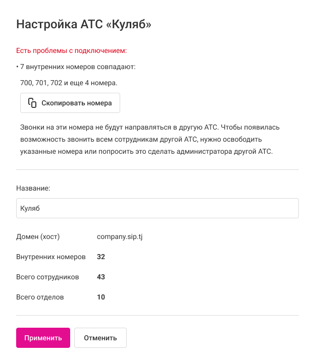 Это не будет препятствовать подключению одной АТС к другой, однако сотрудникам, которые имеют пересекающиеся номера, нельзя будет позвонить из другой АТС. При подключении появится сообщение с предупреждением: