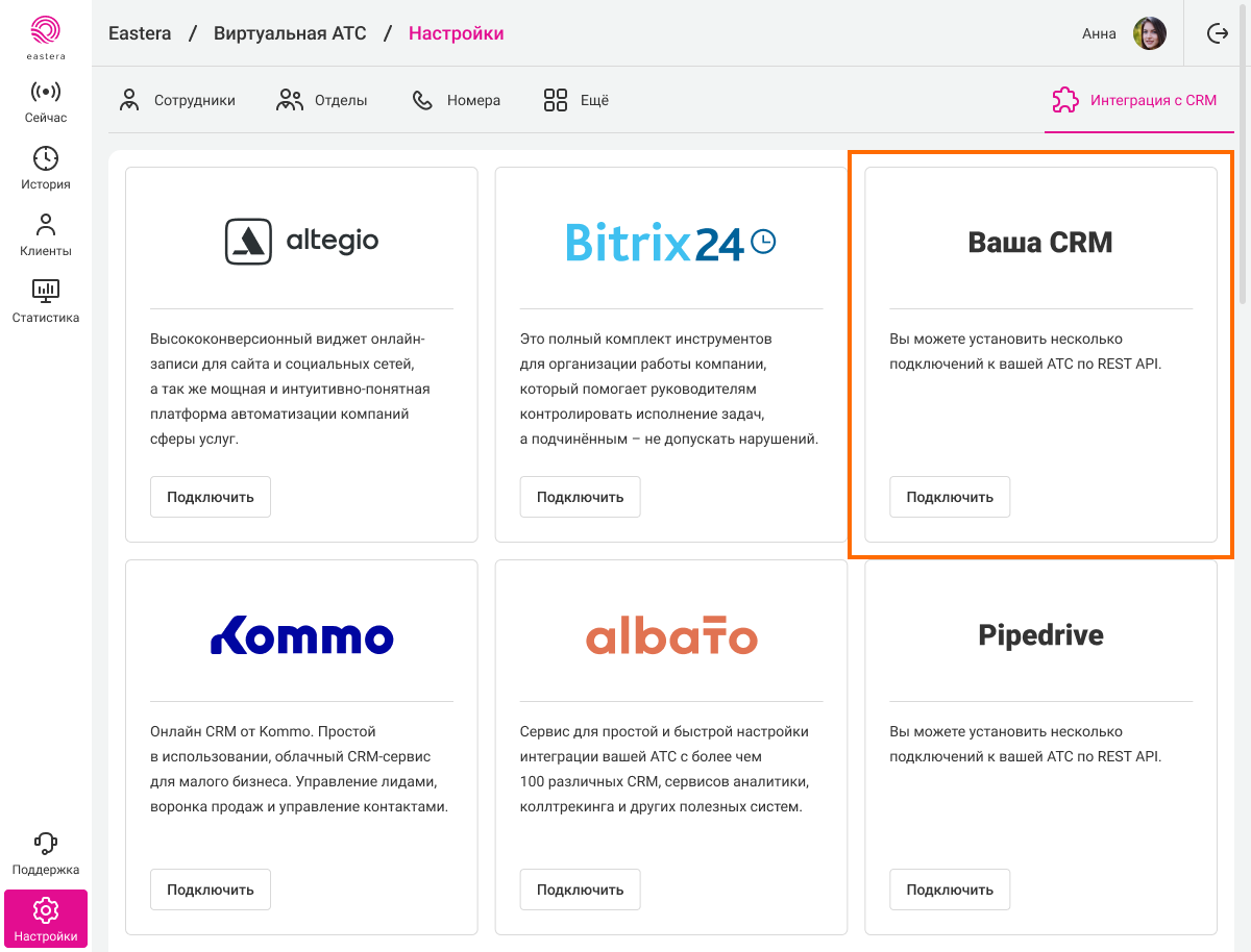 В правом верхнем углу нажмите на кнопку «Интеграция с CRM» и выберите блок «Интеграция с вашей CRM». Нажмите «Подключить».