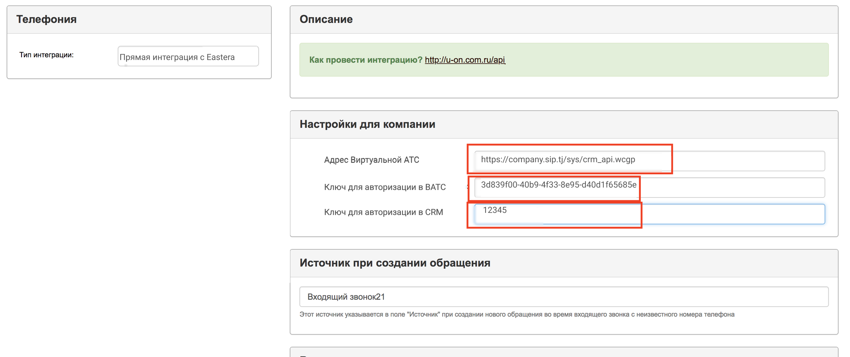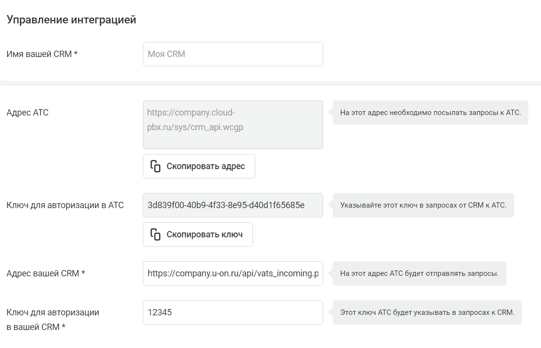 Скопируйте «Адрес АТС», «Ключ для авторизации в АТС» и «Ключ для авторизации в вашей CRM» из АТС и укажите их в системе U-ON.Travel, в разделе «Настройки — Интеграция телефонии».