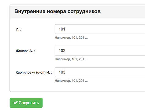 Укажите внутренние номера сотрудников точно так же, как у вас они указаны в АТС.