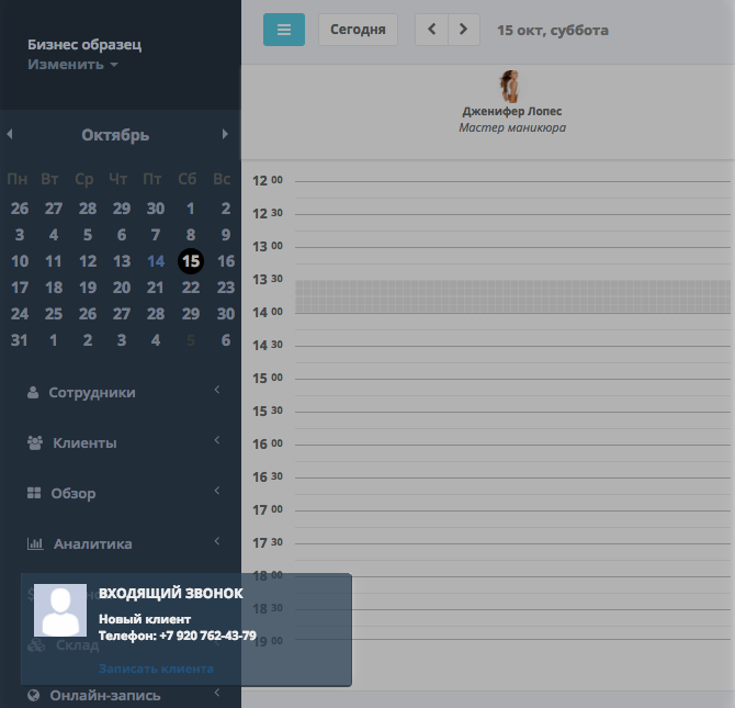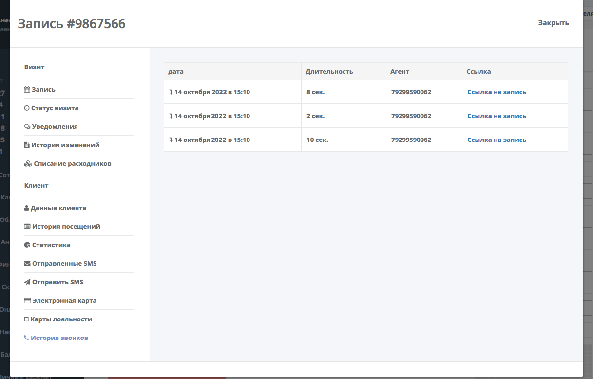 Интеграция с Виртуальной АТС позволит вам уже при входящем звонке видеть имя звонящего клиента и не переспрашивать номер телефона при записи. Вся история и записи звонков будут зафиксированы в карточке клиента.