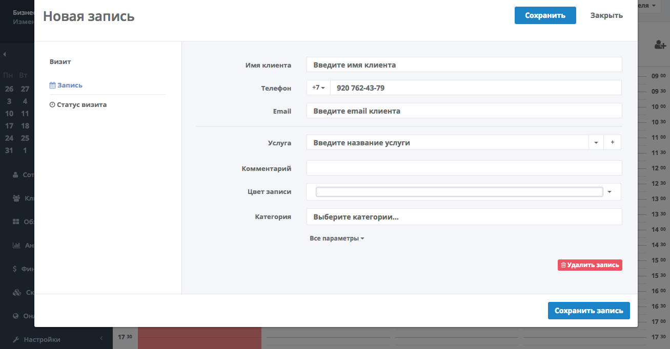 При клике на «Записать клиента» вам не нужно спрашивать и снова вбивать номер клиента, он уже вбит системой.