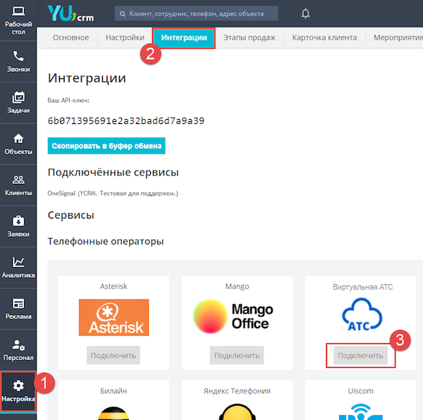 5. Откройте YUcrm в новом окне и перейдите в раздел «Настройка» – «Интеграции». Найдите «Облачная АТС» и нажмите «Подключить».