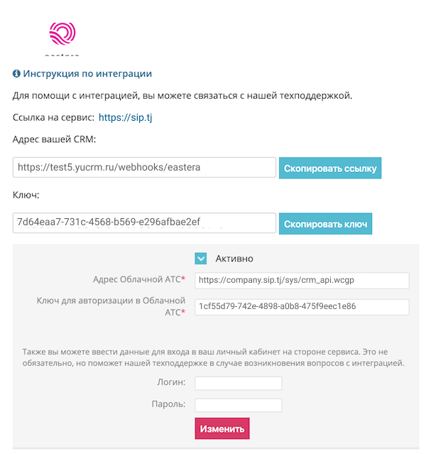7. Скопируйте ссылку для отправки информации и Ключ из YUcrm и вставьте их в соответствующие поля в панели управления вашей АТС.